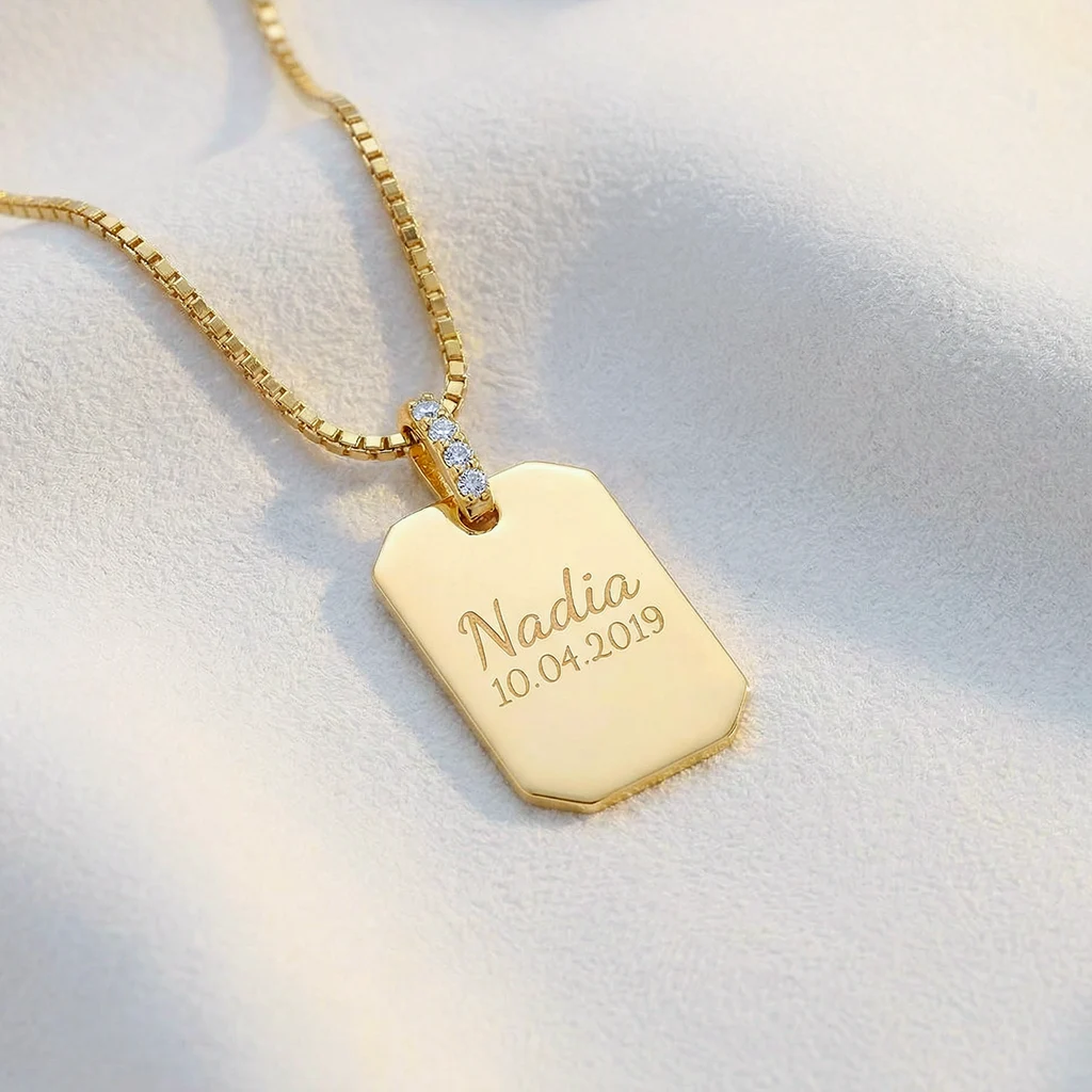 Vedhænget er smukt kombineret med et stensat ophæng med funklende zirkoner, der tilfører et diskret strejf af luksus. Den blanke overflade kan graveres med navn, dato eller en særlig hilsen, hvilket gør halskæden til et unikt og betydningsfuldt minde.