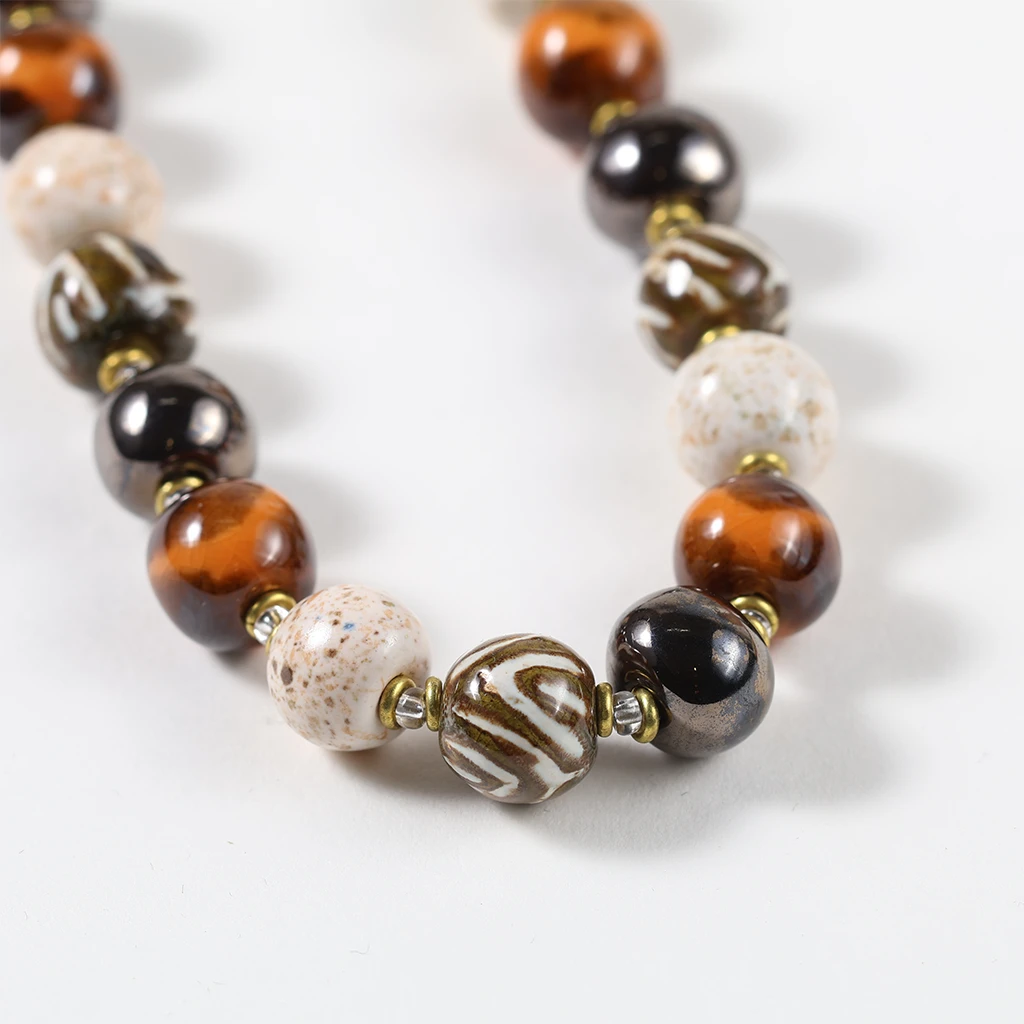 Denne elegante halskæde fra Kazuri kombinerer naturlige farvetoner med unikt håndværk. Smykket er fremstillet af håndlavede keramikperler i varme brunlige nuancer, råhvid med et naturligt præg samt dekorative mønstre i sort og hvid. Sammen skaber de et stilfuldt og tidløst design, der passer perfekt til både hverdag og festlige anledninger.