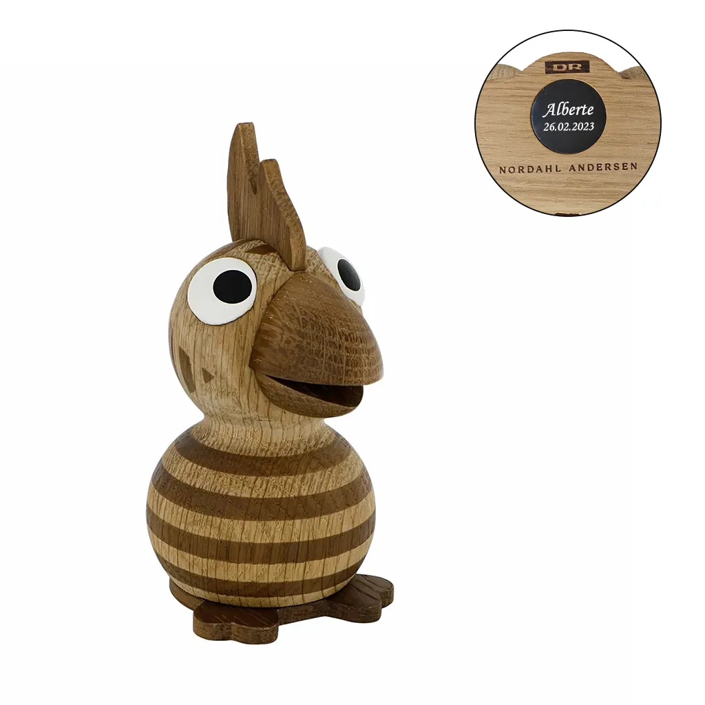 Denne charmerende træfigur er lavet med kærlighed til detaljen, fra de karakteristiske store øjne til de fine striber på kroppen og den søde hanekam. Andrea er udført i smukt egetræ, der giver figuren en varm og naturlig udstråling, som både er dejlig at se på og rar at holde om.