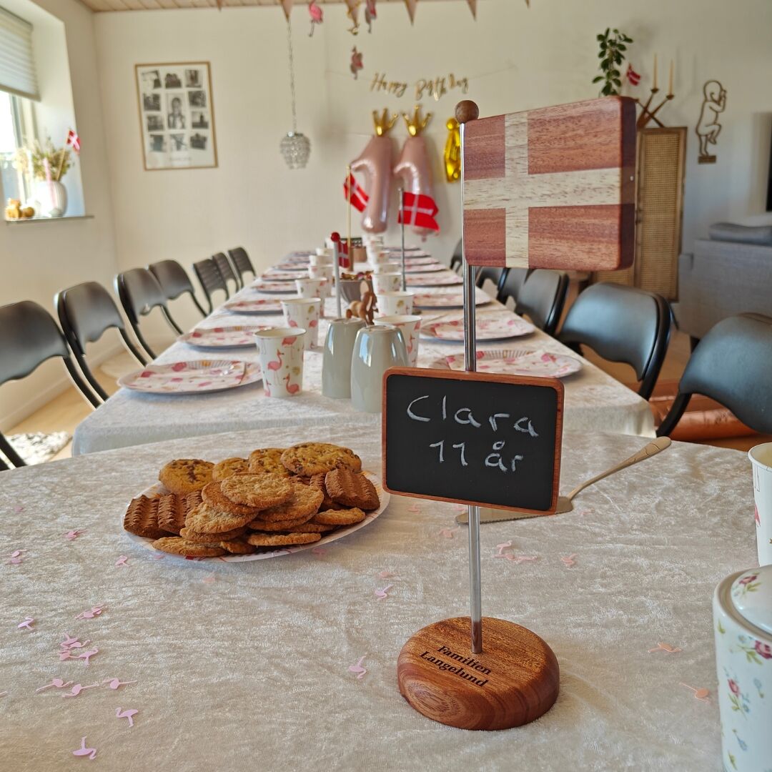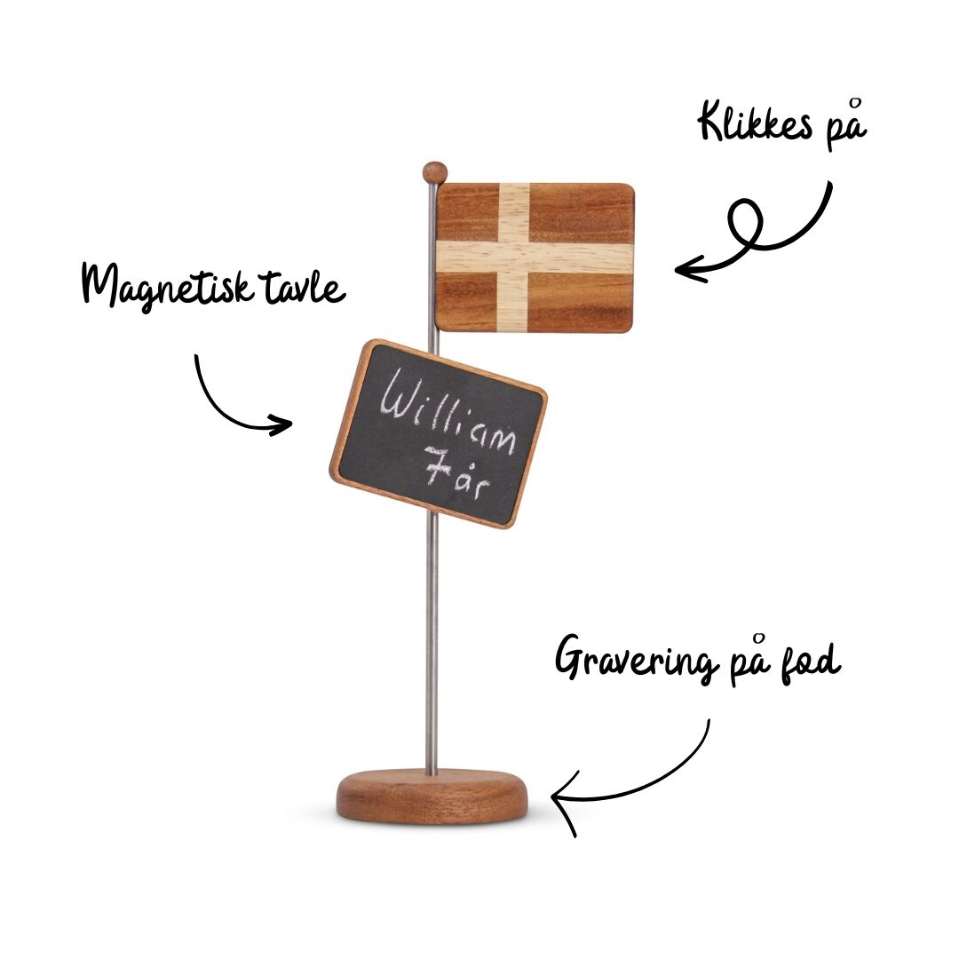 Bordflag har et magnetisk flag som kan påsættes toppen af bordflaget. Derudover medfølger der en magetisk tavleplade som kan påsættes på flaget, så der kan skrives lige det der skal fejres. Det kunne være til barnedåbet, studenterfesten, fødselsdagen.