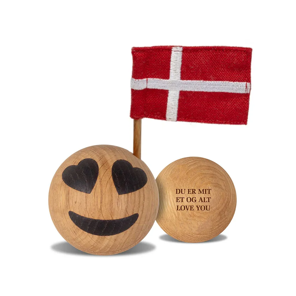 Heart Eyes Celebration fra Spring Copenhagen, er en sød træfigur med det danske flag, der kan stå og pynte i ethvert hjem eller kontor.