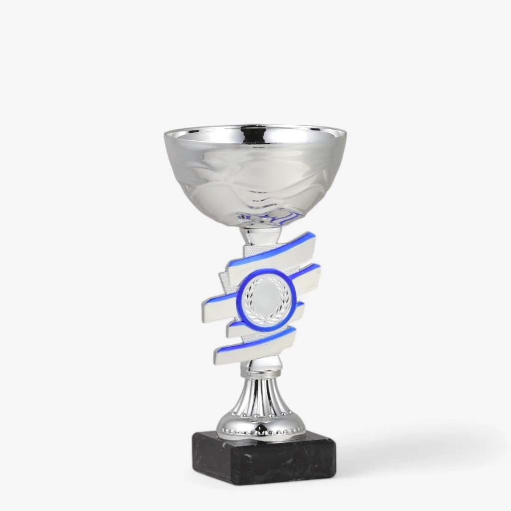 Chrompokal med blå detaljer på mellemstykket.