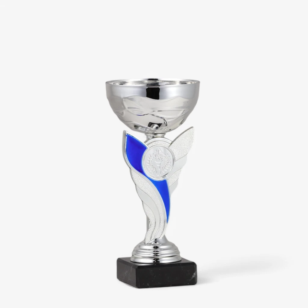 Denne imponerende pokal er den perfekte anerkendelse til enhver præstation eller begivenhed. Pokalen er fremstillet med chrom cup i metal og plast mellem stykke – Her står den flot med sit unikke design, der kombinerer traditionelle og moderne elementer. Den blå farveindsats skaber en smuk kontrast til det glitrende sølv, hvilket giver pokalen et distinkt og mindeværdigt udseende.
