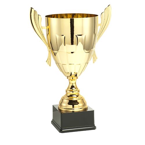 Stor prestigepokal i guld med metal stykke i bunden.