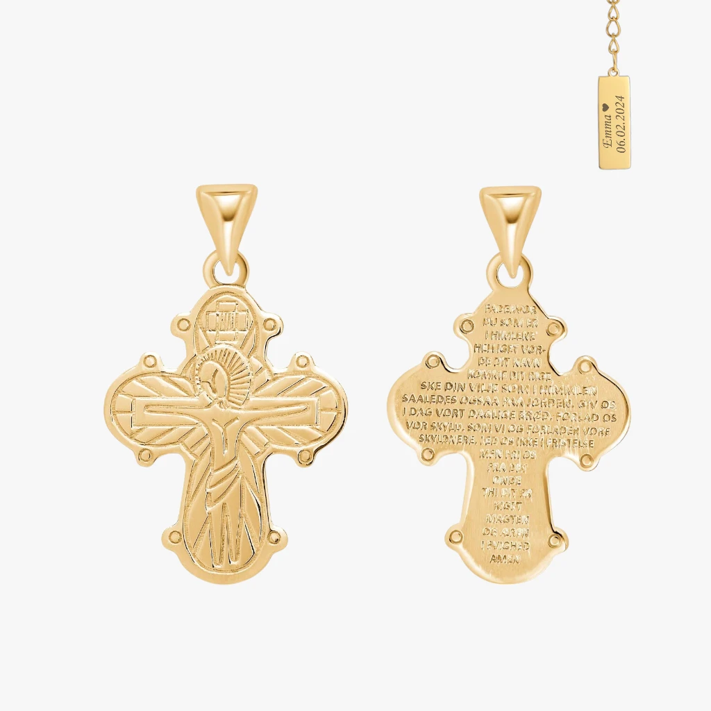 Forgyldt sølvkors med den korsfæstede Jesus afbilledet i stilistisk udgave på forsiden og Fadervor på bagsiden.