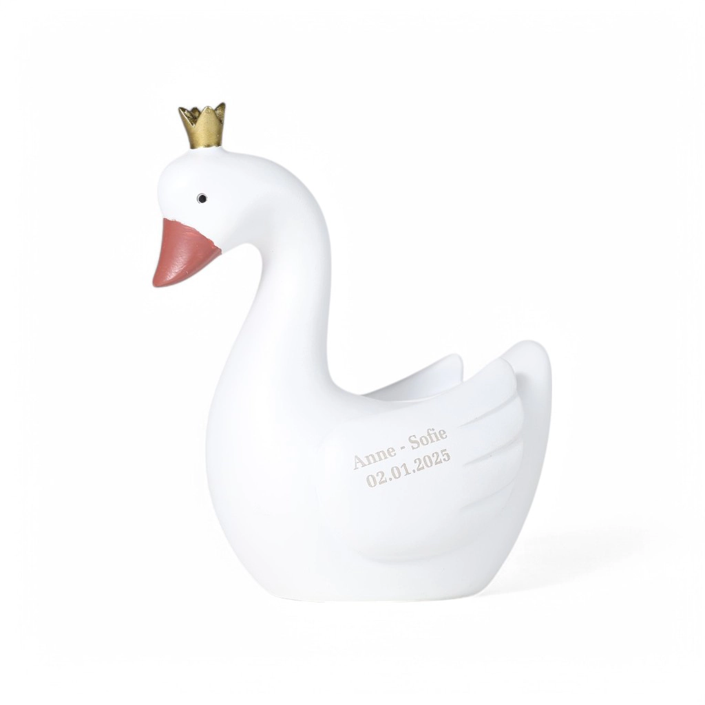 Den hvide svane har et blødt, mat finish, mens dens næb og krone tilføjer et strejf af farve og elegance. Perfekt som en personlig gave til barnedåb, fødselsdag eller andre særlige anledninger. Med mulighed for gravering kan denne sparebøsse gøres helt unik og blive et varigt minde om en speciel dag.