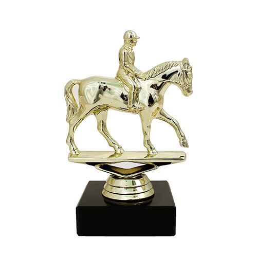 Dressurhest i guld på marmorsokkel.