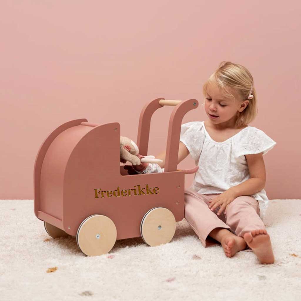 Personliggør dukkevognen med navn på barnet, hvilket gør det oplagt som en gaveidé til barnets barnedåb/fødselsdag.