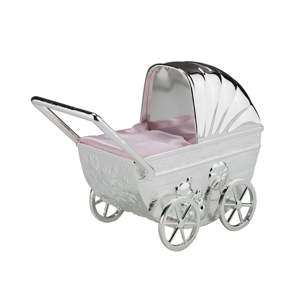 Dukkevognen har en lille dyne af lyserødt satin stof.