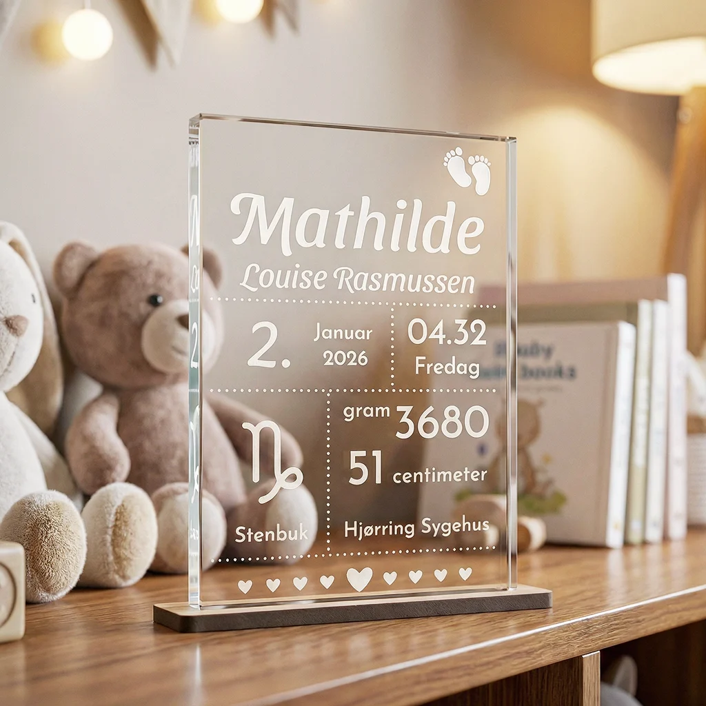Forevig dit barns fødsel, med en fødselstavle i flot krystalglas med lasergravering.