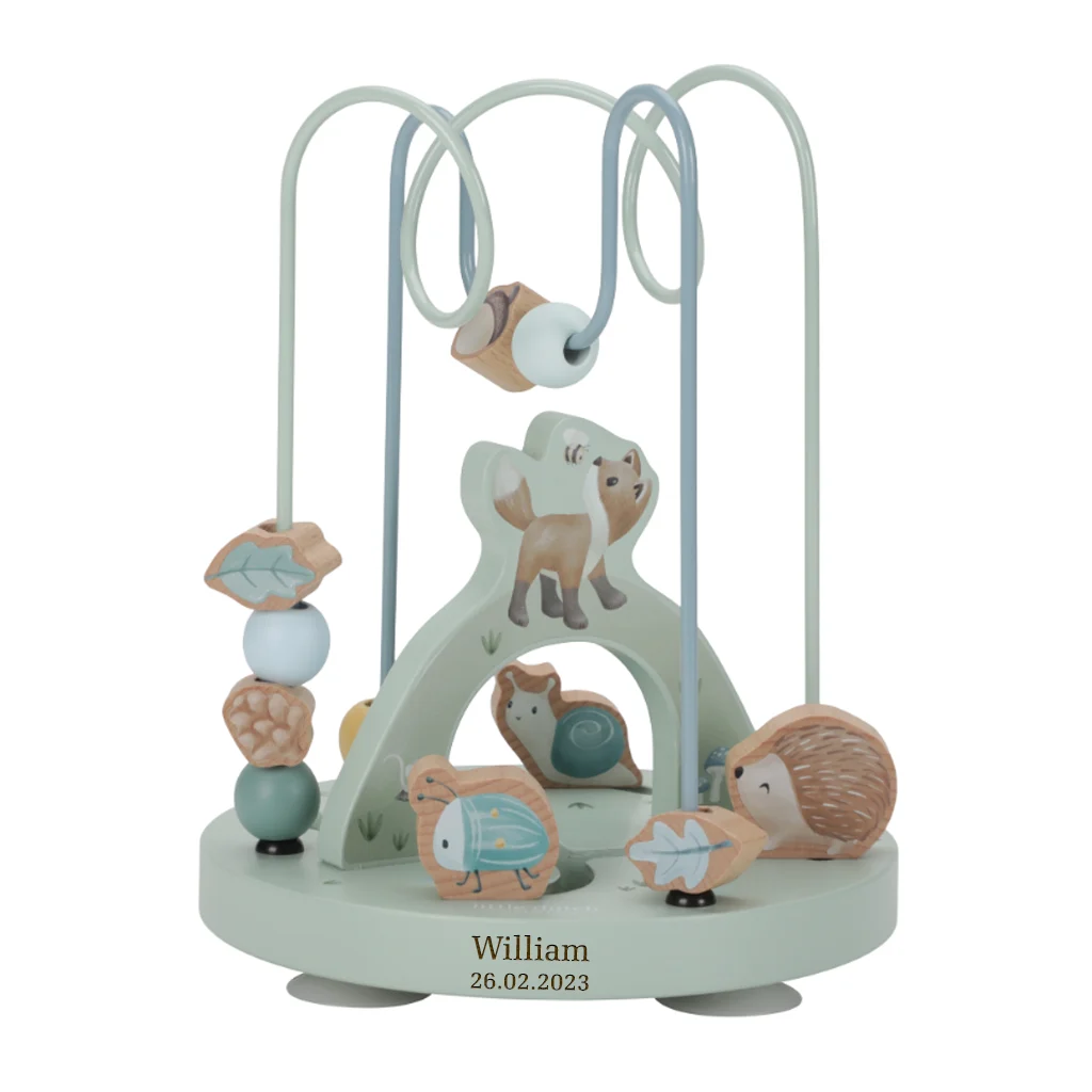 Tag med på eventyr i skovens fortryllende verden med denne charmerende aktivitetsspiral. Lad de små fingre udforske og føre perlerne fra side til side, mens de møder skovens søde beboere: den nysgerrige ræv, det buttede pindsvin, den travle bille og den langsomme lille snegl.