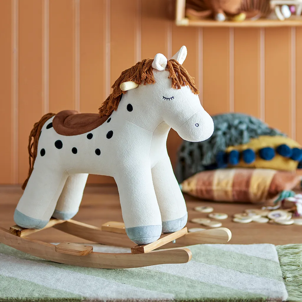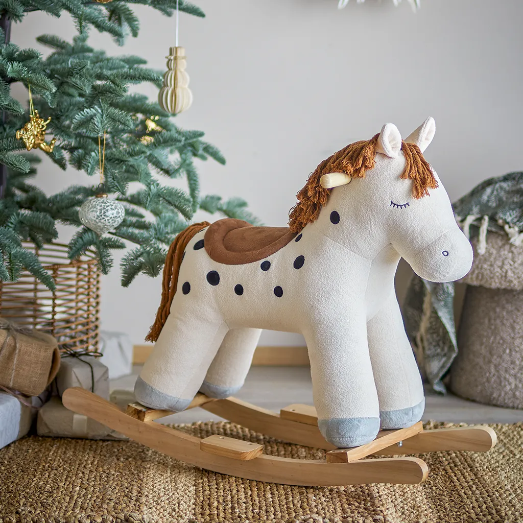 Merlen Gyngehesten fra Bloomingville MINI er en charmerende klassiker i moderne nordisk design, der vil bringe glæde og leg ind i børneværelset. Den søde hvide hest med sorte prikker har et roligt og venligt udtryk, lukkede øjne og blød pels, som gør den ekstra hyggelig at lege med.