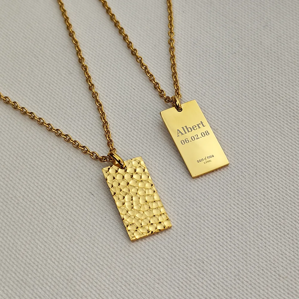 Fejr livets store øjeblikke med Son of NOA’s hamrede halskæde i guldbelægning. Denne halskæde forener håndværk og personliggørelse og er ideel som gave til mindeværdige anledninger. Det teksturerede vedhæng fanger lyset med sin unikke hamrede overflade, mens det glatte vedhæng tilbyder plads til din personlige gravering – helt gratis.