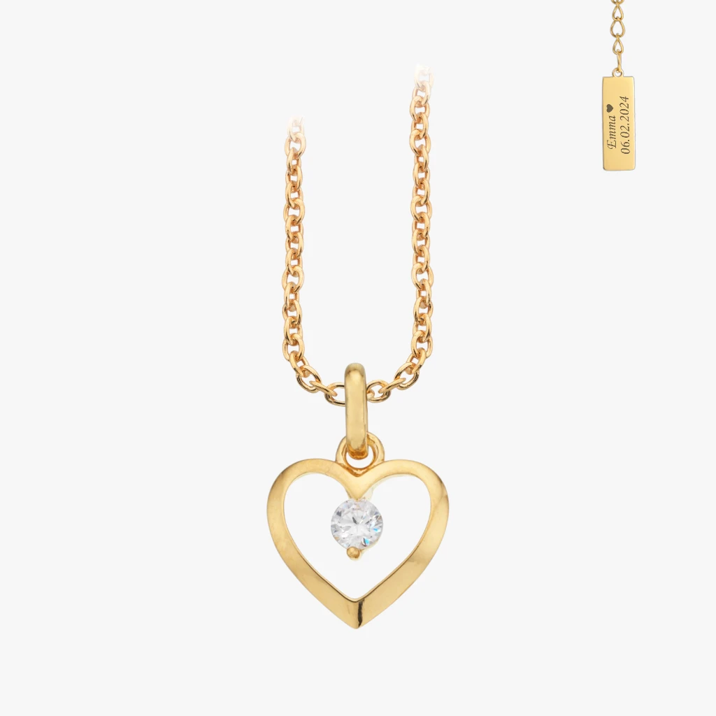 Dette smukke hjerte-vedhæng i elegant guldbelagt design fanger øjet med sin enkle, men udtryksfulde form. Den skinnende hjertesilhuet omkranser en funklende, klar krystal i centrum, der fanger og reflekterer lyset med hver bevægelse