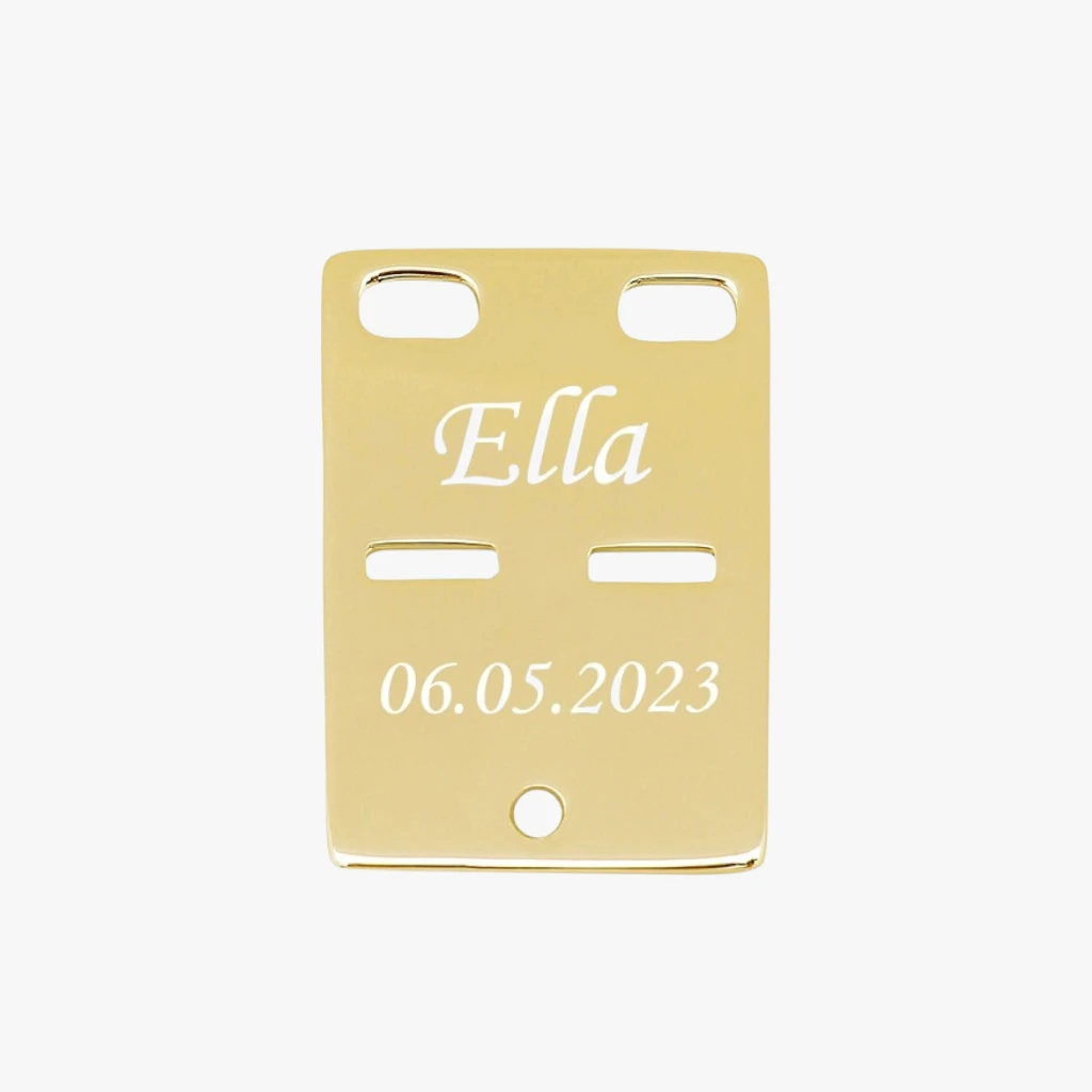 Et flot forgyldt Id tags til både drenge og piger. Id taget bliver graveret på forsiden med ønsket gravering. Teksten vil fremstå i flot lys/hvid og her kan der ca. være 10 tegn på hver linje. Her kan alle vores skrifttyper anvendes og være en fin gave til både drenge og piger.