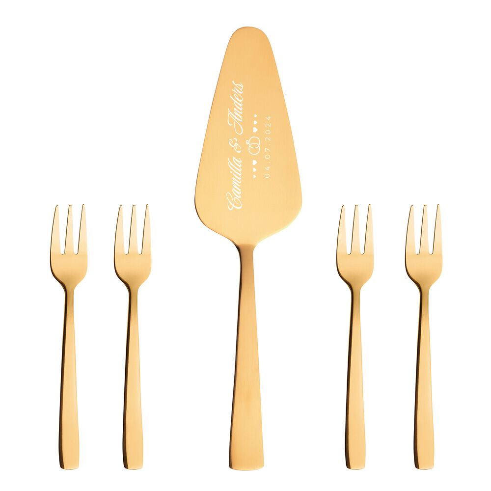 Elegant kagesæt med 4 kagegafler og 1 kagespade. Et kagebestik der er skabt til knivskarpe kager, som fortjener at blive serveret og spist med stil.