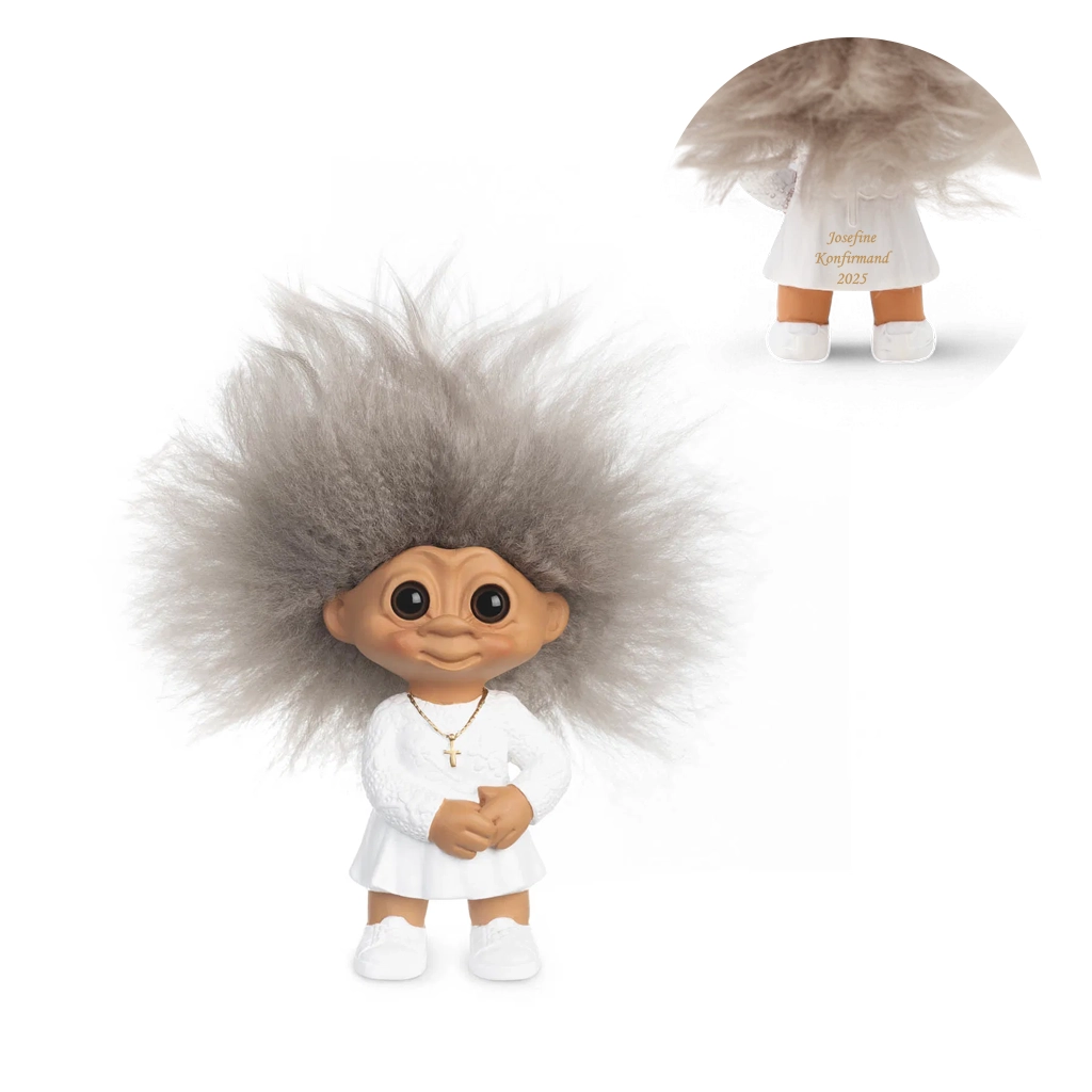 Denne skønne Konfirmand Lykketrold er en hyldest til en helt særlig dag – konfirmationen. Med sit karakteristiske viltre hår, store glade øjne og sit varme smil, udstråler hun både uskyld, glæde og forventning. Hun er iført en fin, hvid konfirmationskjole og bærer et smukt lille guldkors som symbol på tro og tradition.