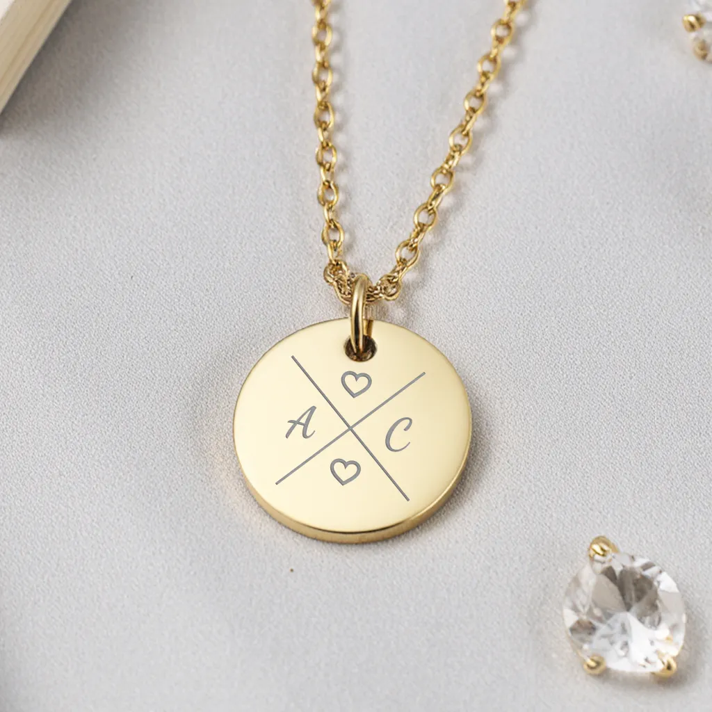 Gør dit smykke unikt med en personlig gravering på dette initial halskæde. Dette runde vedhæng i 18k guldbelagt 316L Rustfrit Stål har et moderne og minimalistisk design med et kryds-motiv, der skaber fire felter til gravering af initialer eller symboler efter dit valg.