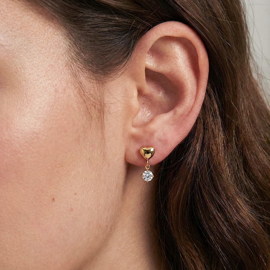 Disse fine øreringe kombinerer et romantisk design med et strejf af glamour. Det bløde, hjerteformede ørestik danner en smuk kontrast til det funklende, runde zirkonia-vedhæng, som bevæger sig let og fanger lyset ved hver bevægelse.