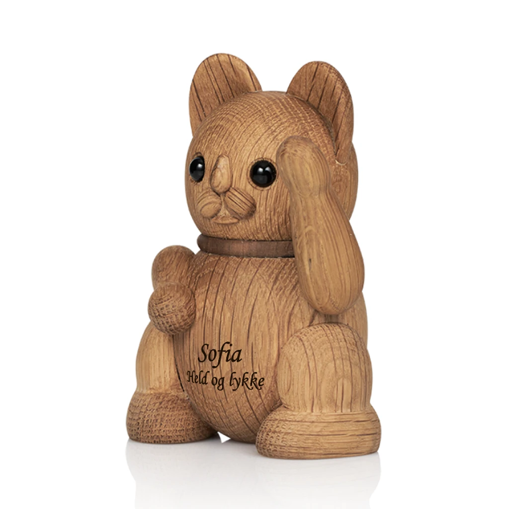 Denne smukke Lucky Cat i træ fra Lucie Kaas er mere end bare en dekorativ figur – den er et symbol på held og lykke. Udført i høj kvalitet egetræ, kan denne kat personliggøres med en indgravering, der gør den til en unik gave til en særlig person. Perfekt som gave til barnedåb, fødselsdag eller andre særlige anledninger såsom svendegaver eller studentergaver, hvor ønsket om held og lykke er i fokus.