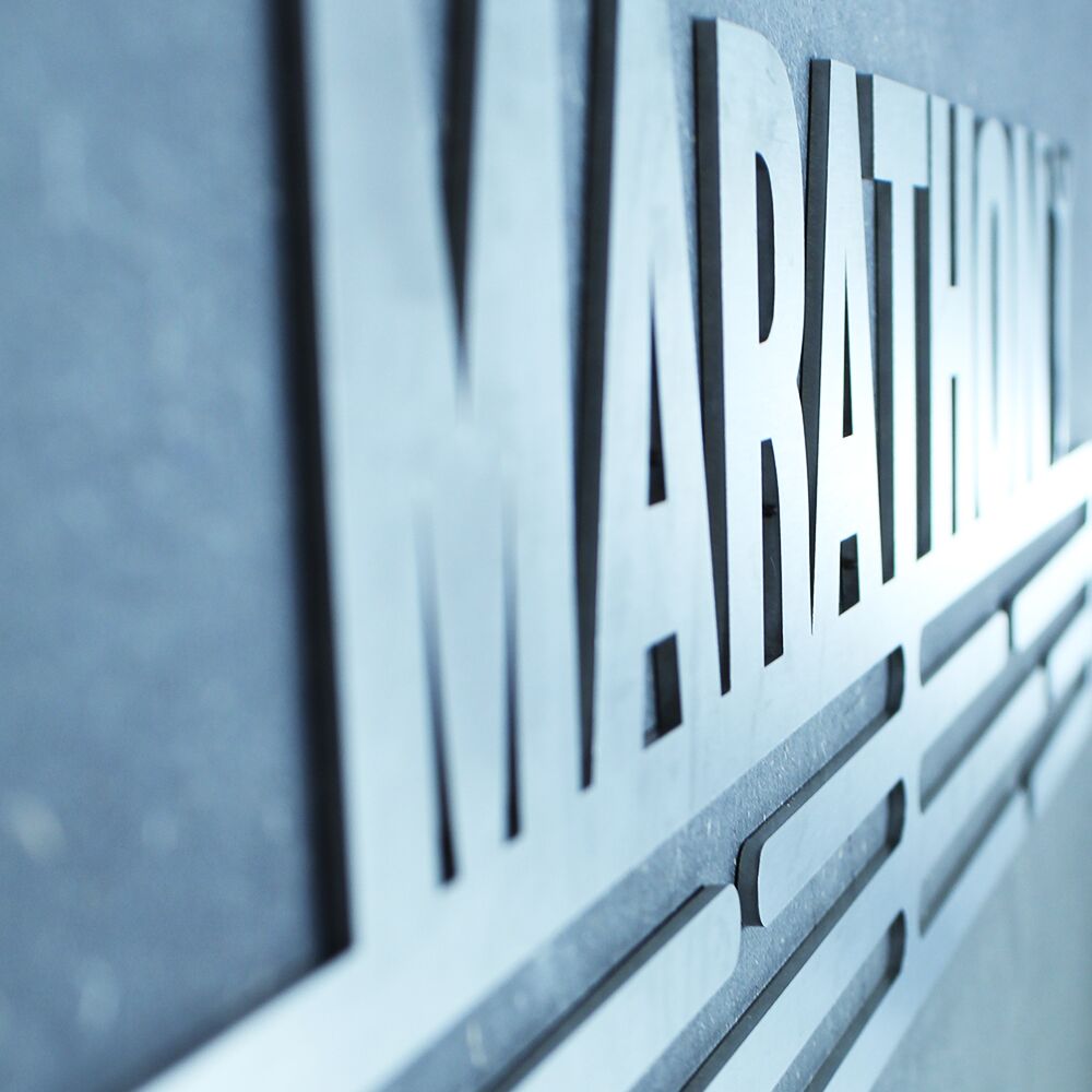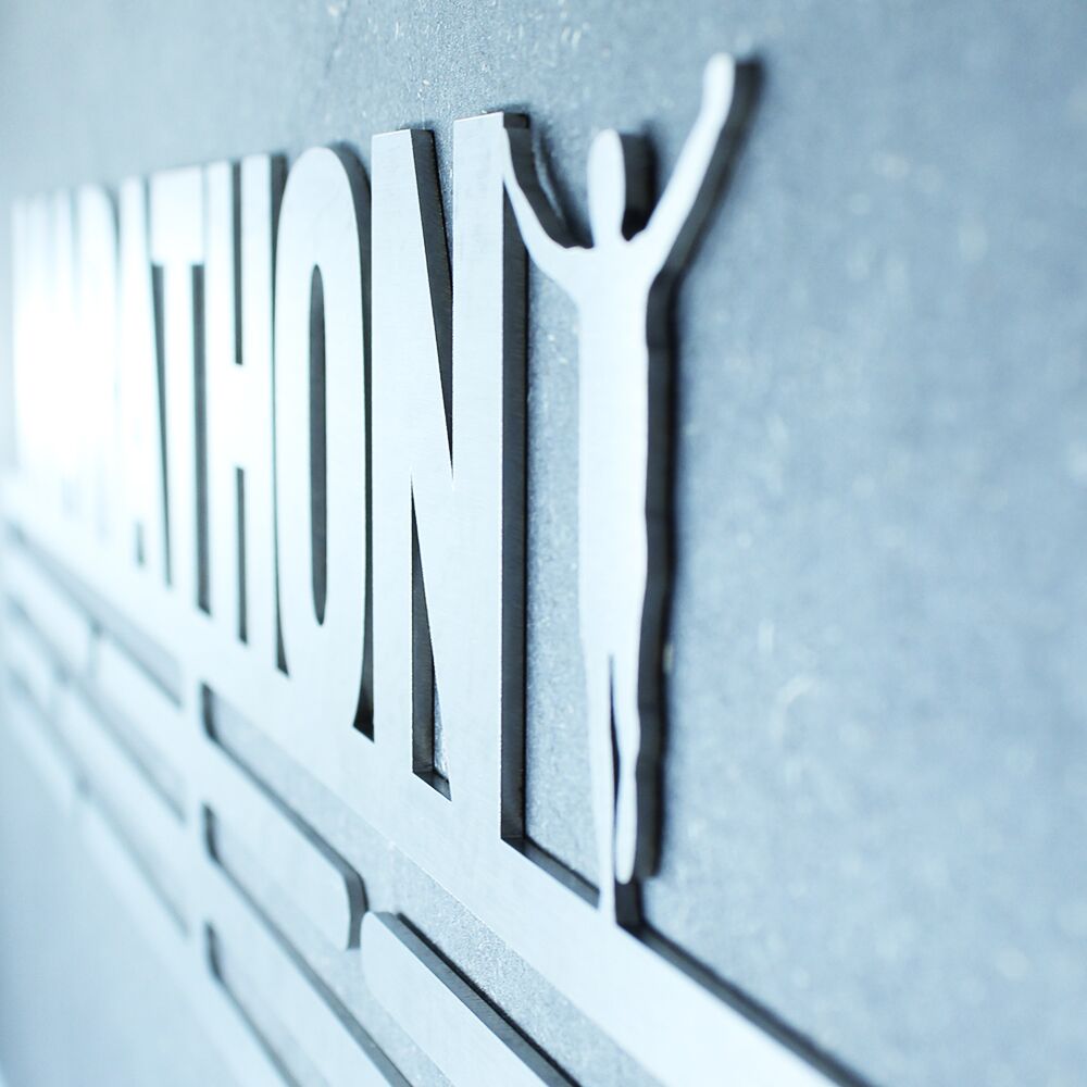 Medalje ophæng med Marathon motiv udskåret i børstet stål.