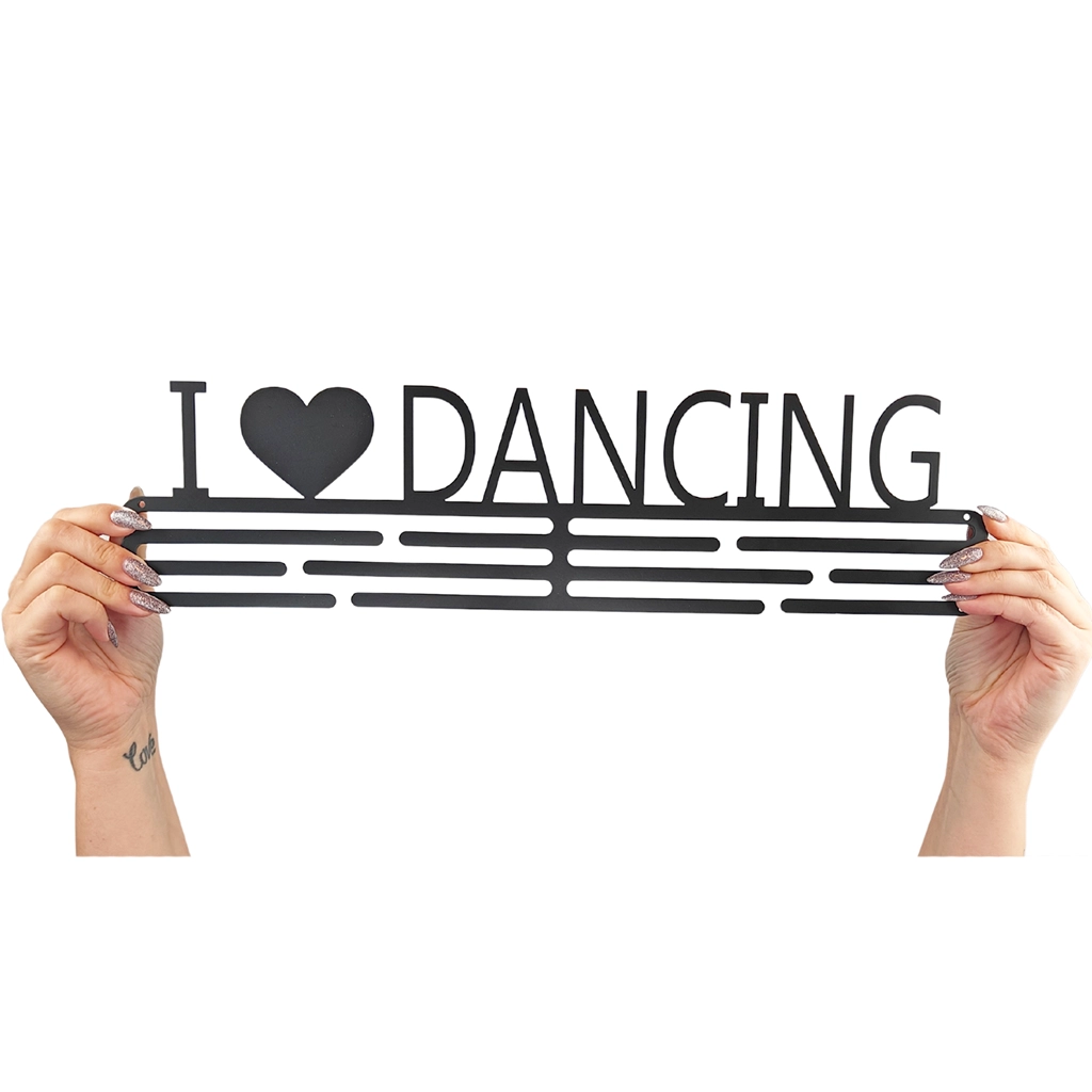 Medalje ophæng med I Love Dancing motiv udskåret i børstet stål.