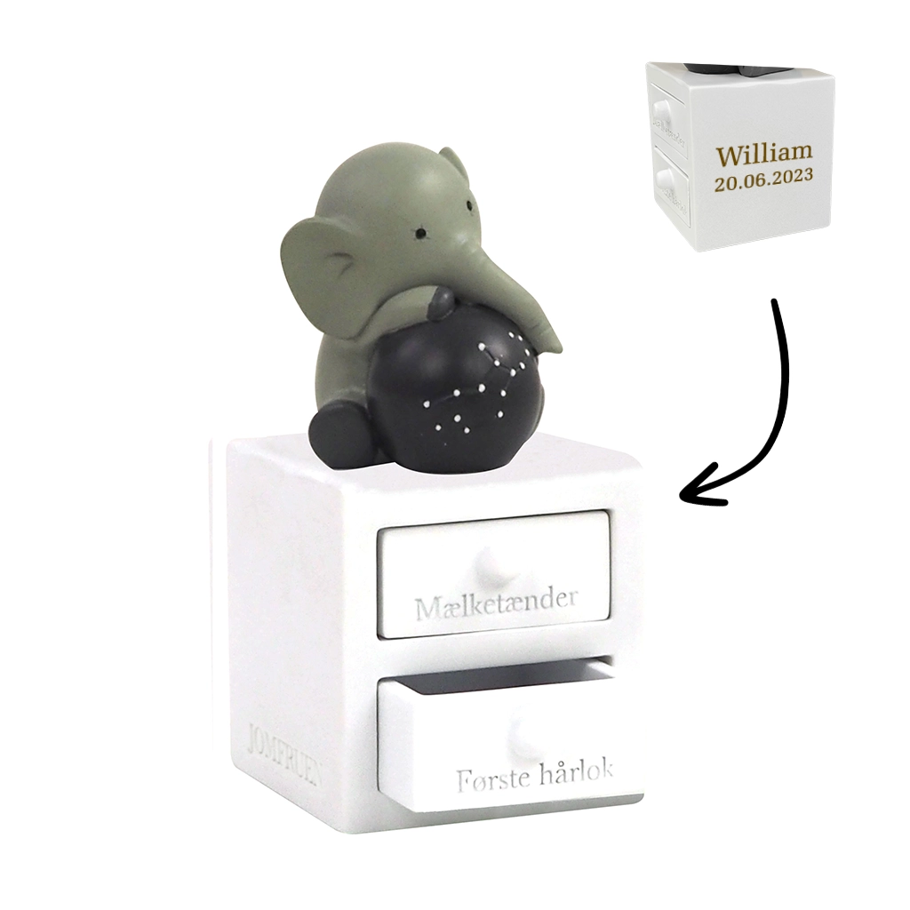 Skrinet har to små skuffer, hvor der er plads til at opbevare mælketænder og den første hårlok. Hver skuffe er mærket med henholdsvis “Mælketænder” og “Første hårlok” i en elegant skrift, hvilket gør det nemt at organisere disse værdifulde minder.
