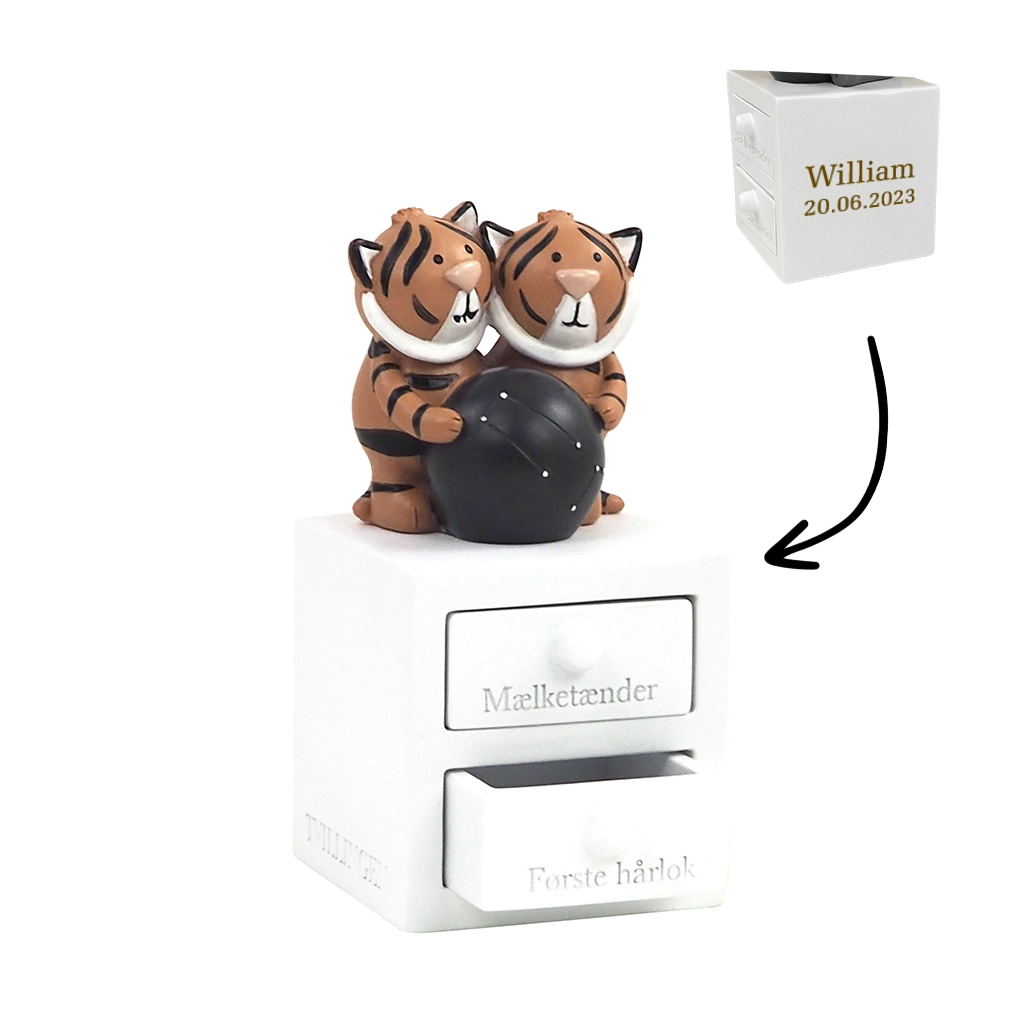 Skrinet har to små skuffer, hvor der er plads til at opbevare mælketænder og den første hårlok. Hver skuffe er mærket med henholdsvis “Mælketænder” og “Første hårlok” i en elegant skrift, hvilket gør det nemt at organisere disse værdifulde minder.