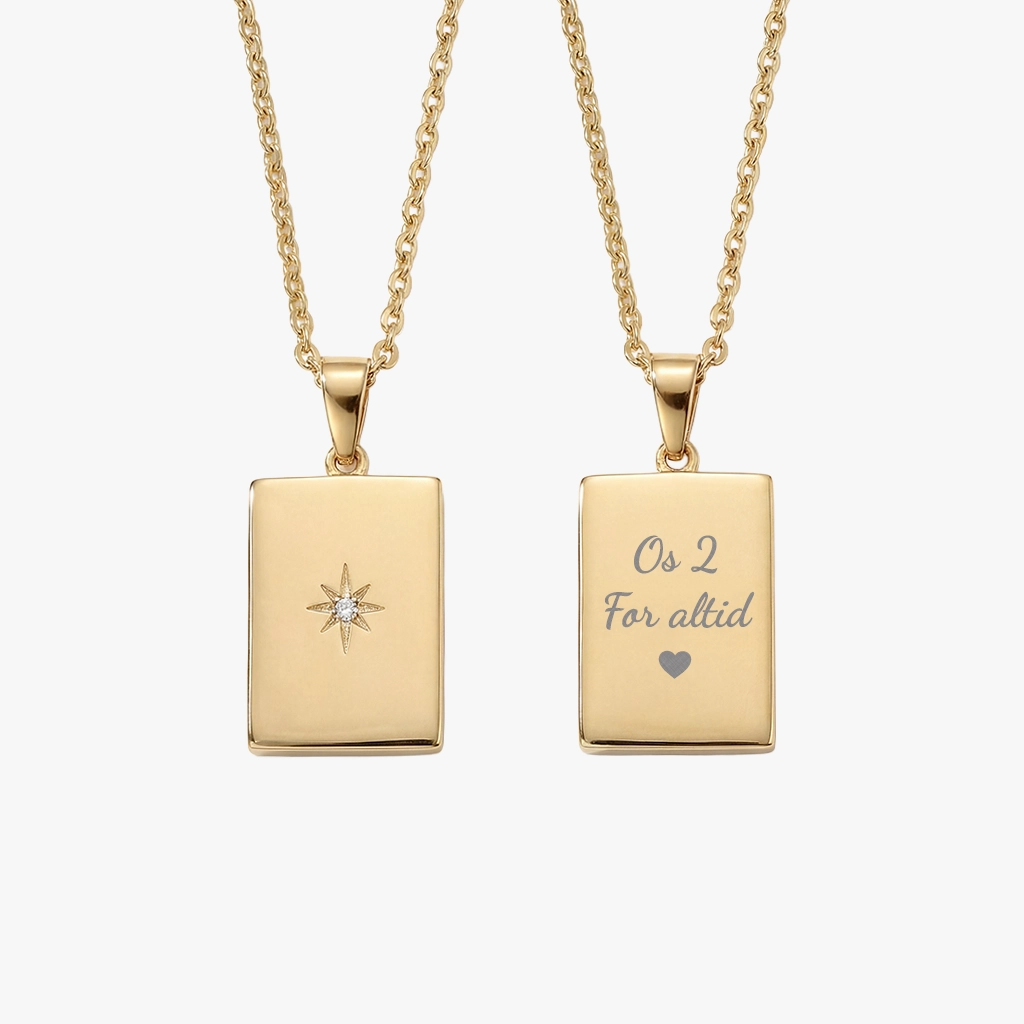 Nova er en smuk og tidløs halskæde designet til at bære dine dyrebare ord tæt på hjertet. Det gyldne vedhæng er prydet med en elegant stjernedetalje på forsiden, mens bagsiden kan personliggøres med din helt egen tekst – f.eks. et navn, en dato eller en kærlig besked.