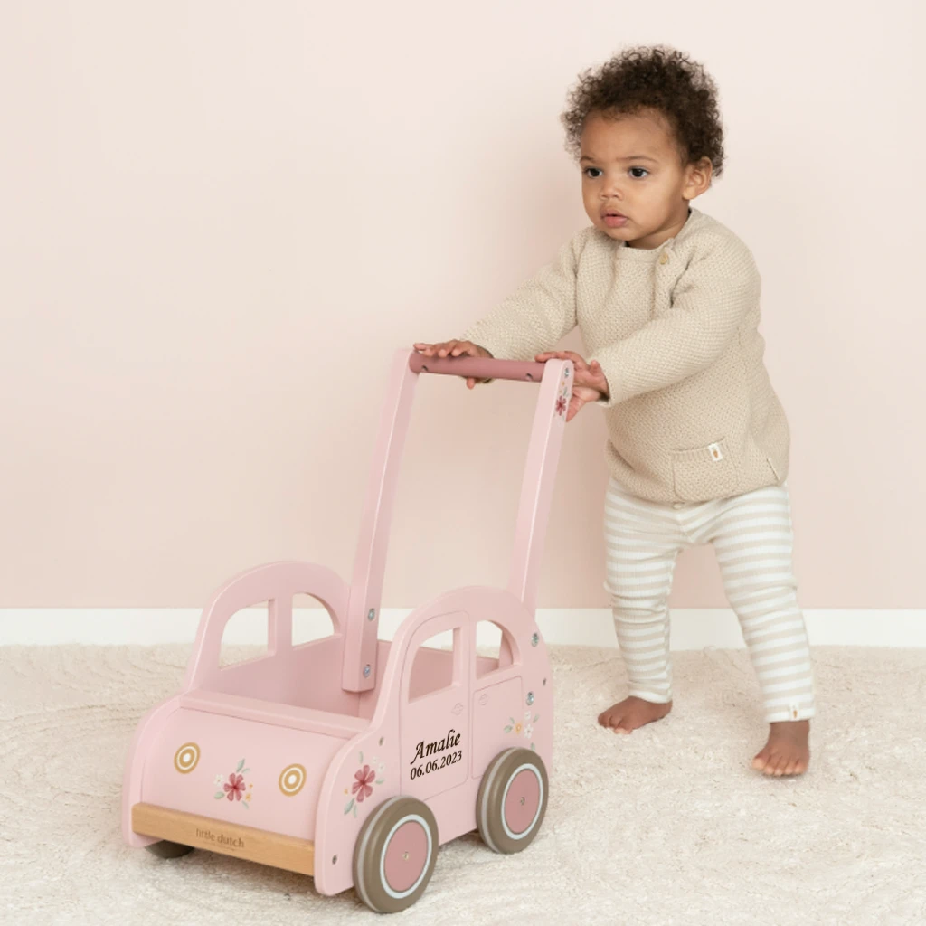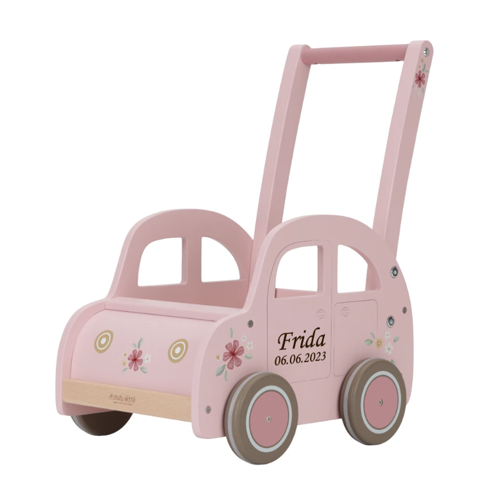 Giv dit barn den perfekte støtte, når de skal tage deres første skridt med denne yndige gåvogn fra Little Dutch. Gåvognen er designet som en sød, lyserød bil med fine blomsterdetaljer, hvilket gør den både funktionel og dekorativ. Med personlig gravering af barnets navn og fødselsdato gør du den helt unik og personlig.