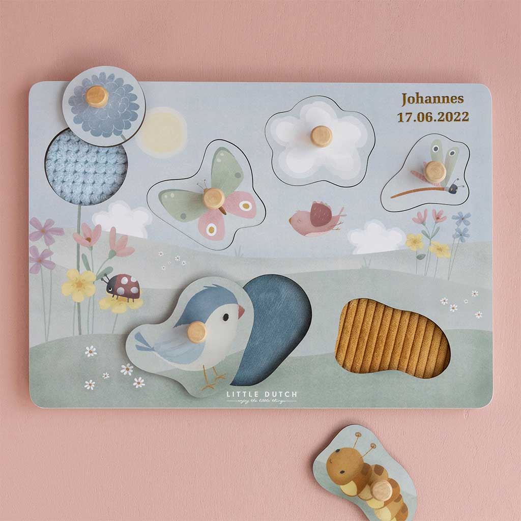 Flot sanse-puslespil fra Flowers & Butterflies serien. Løft brikkerne og føl de forskellige struktur under brikkerne.