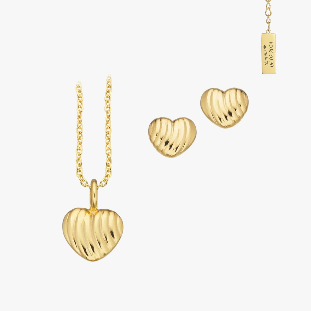 Dette smukke smykkesæt fra Scrouples består af et elegant forgyldt hjertevedhæng og matchende ørestikker.