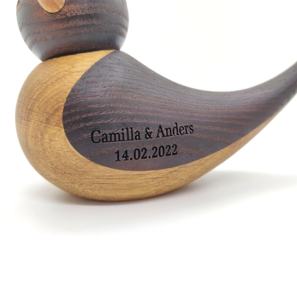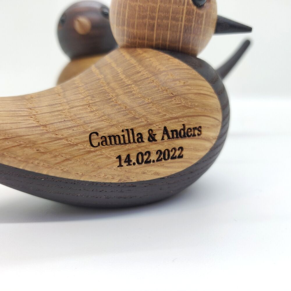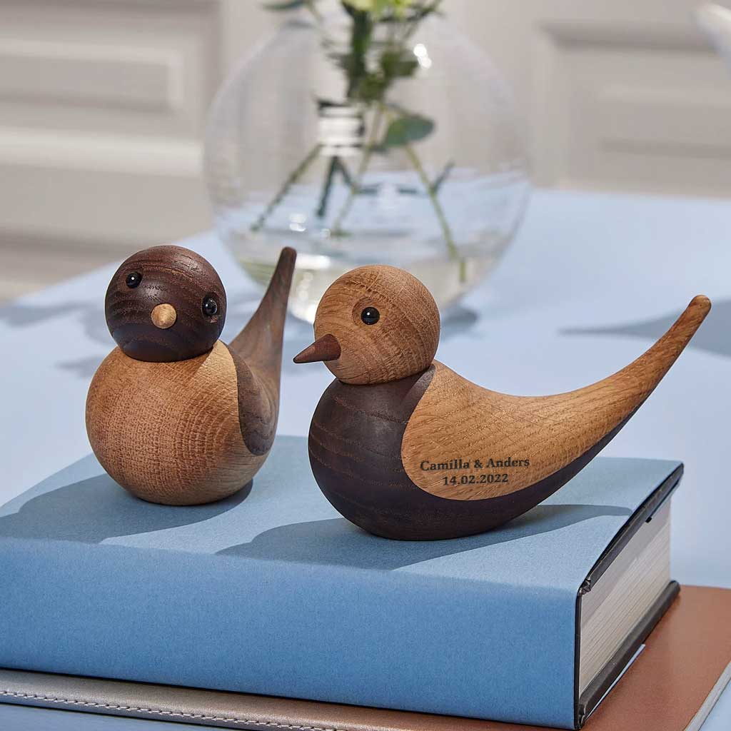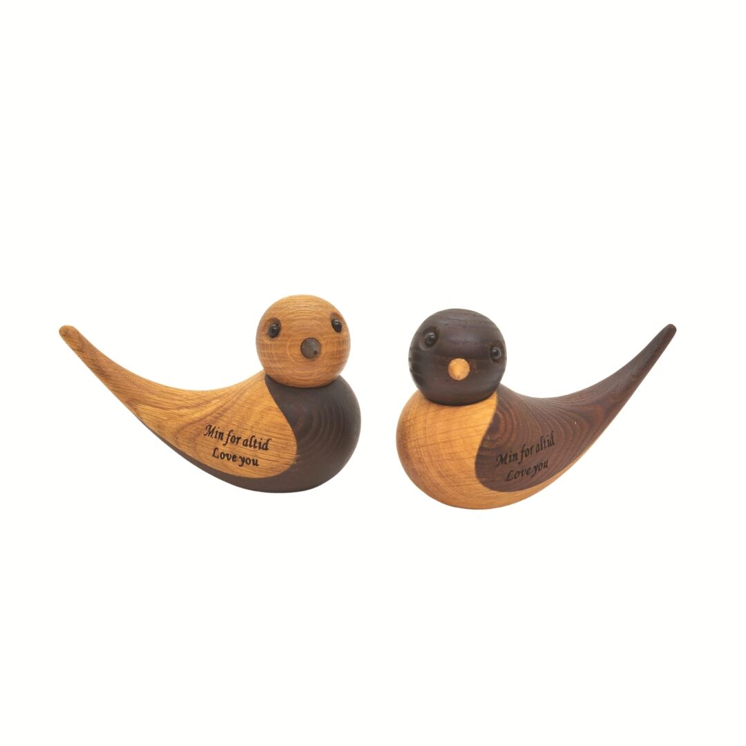 Mulighed for lasergravering på begge fugle. Vi laver graveringen på siden, så de kan stå og vise deres tekst frem, eller de kan stå modsat så teksten bliver skjult bagved.