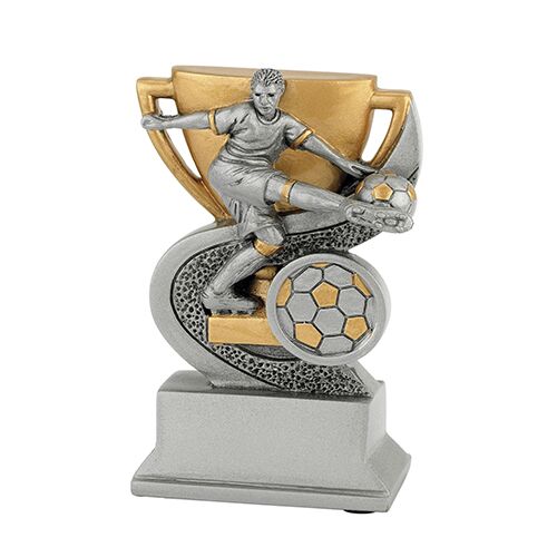 Resin statuette med fodboldspiller og plads til emblem.