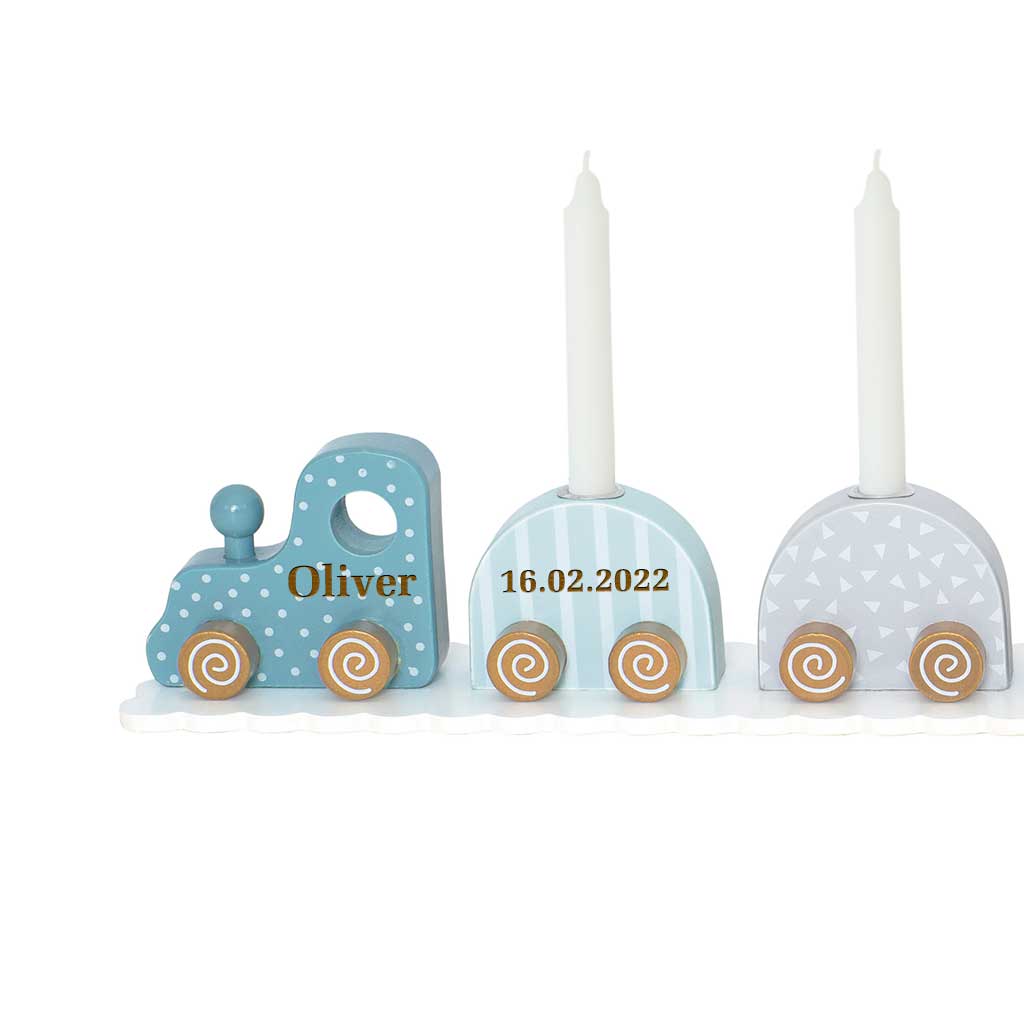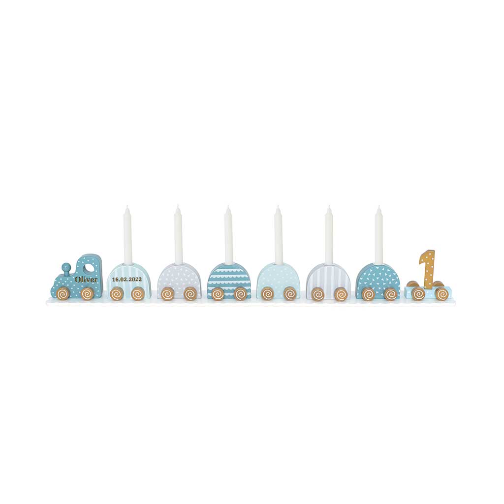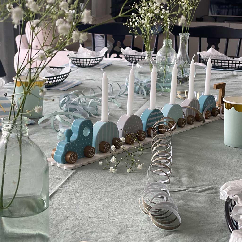 Gør fødselsdagen ekstra magisk med dette charmerende fødselsdagstog i træ, malet i bløde blå og lyse pastelfarver. Toget består af et sødt lokomotiv og seks vogne, hvoraf hver kan holde et lys, der spreder en hyggelig stemning omkring fødselsdagsbordet.
