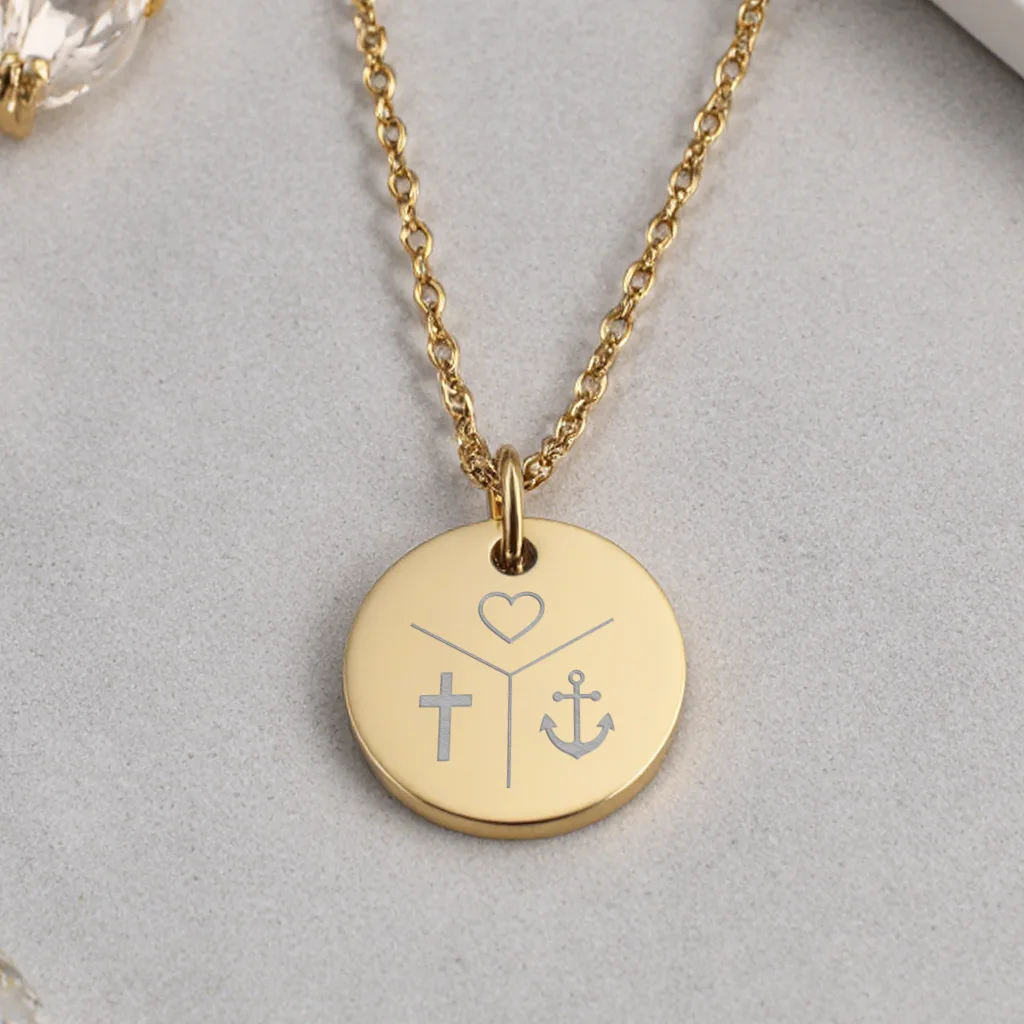 Smuk og unik halskæde med tro, håb og kærlighed graveret på forsiden